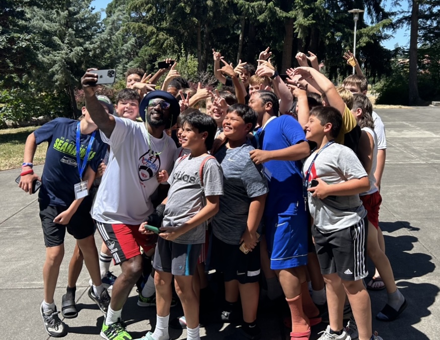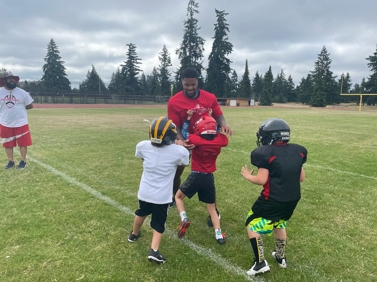 (Campers trying to tackle Seattle Seahawk Dre'Mont Jones)